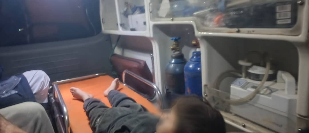 وقام الفريق ع الفور بتحويل الطفل إلى المشفى الوطني في دير الزور بسيارة الاسعاف الخاصة بجمعية نبض سورية